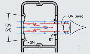• Projects bright frame line into the scene. • Provides bright, unaltered view of the scene. • There is no motion parallax between frame and the scene. • No lenses to scratch. • Near zero cost. |