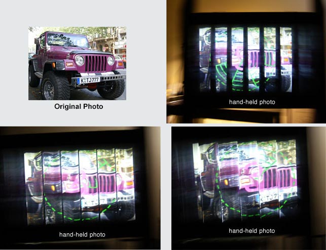 Top-left: the original photo to be displayed. The remaining three photos are attempts to take a time lapse shot while moving the camera to the left (to simulate the moving train). Top-right shot is the result of moving too slow during the shot.