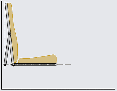 Like many mechanisms at the time, this started as cardboard cutouts pinned to a board with thumb tacks. I found that the midpoint of the backrest moved in an arc. By attaching a link at that point, when the bottom was slid horizontally out from the wall, the top of the backrest dropped straight down at a uniform distance from the wall.